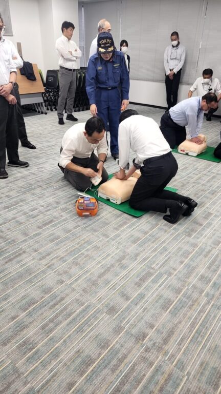 その後は事務所に戻り、大会議室で心臓マッサージとAEDの操作訓練を実施しました。